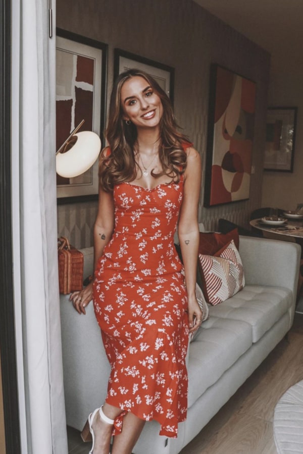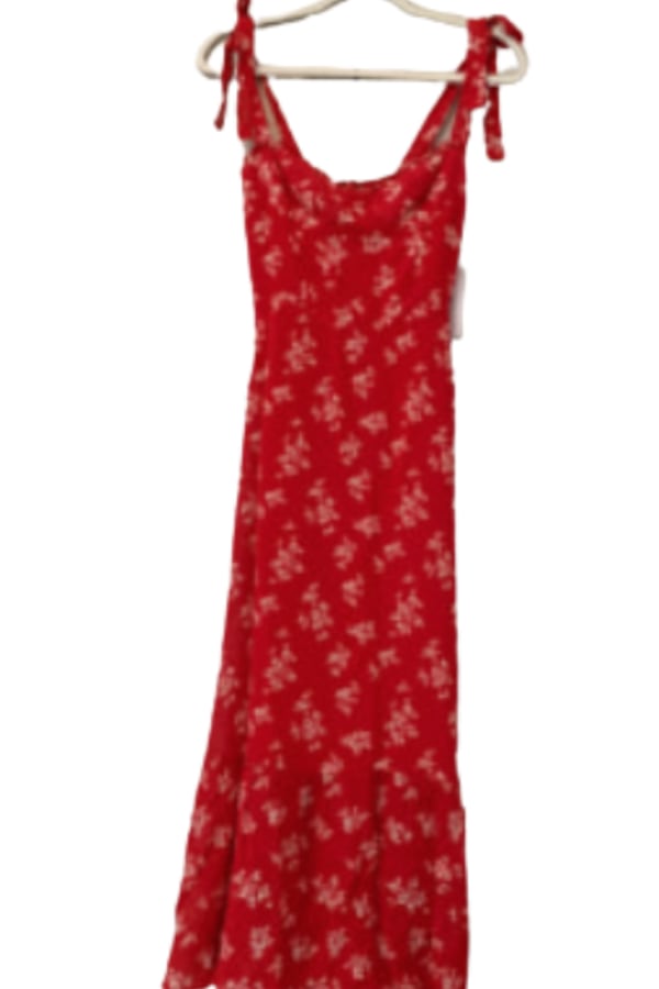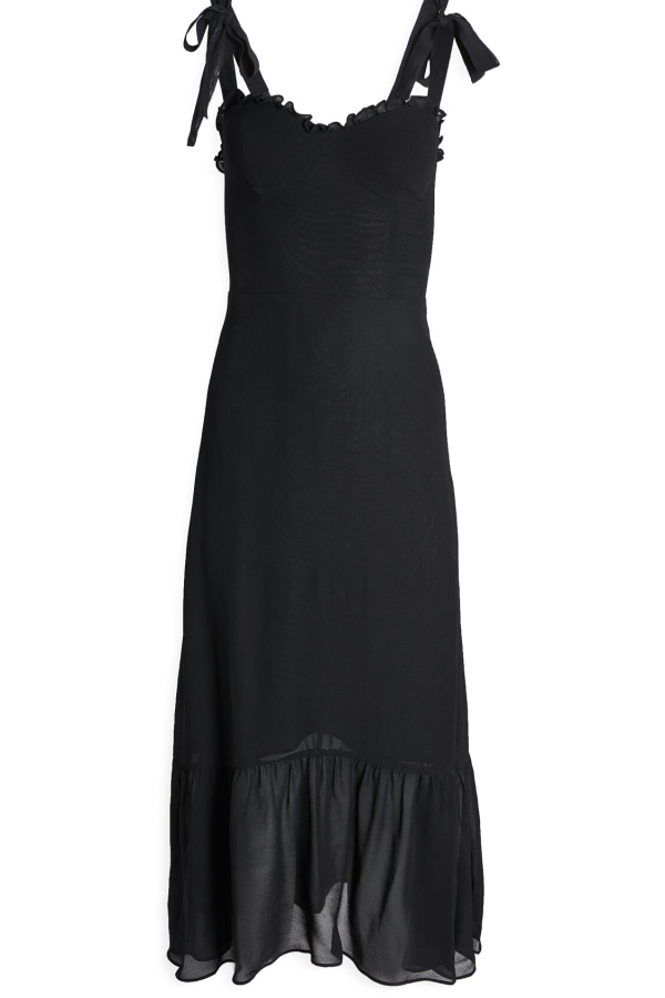 What are managed items. This midi length dress has a ruffle edged neckline adjustable strap ties and a trumpet skirt. Featuring a frilly neckline and pretty floral print this Reformation dress is a great pick for warm-weather.