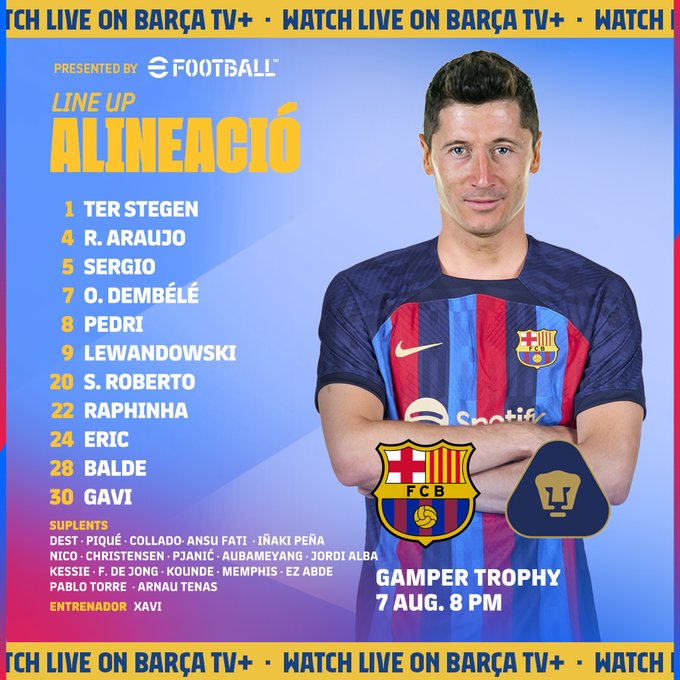 2 days agoPossible Barcelona lineup against Pumas UNAM. The Greatest Stadium on Earth opens its doors for the first time in three months for the final match of Barcelonas preseason. The Catalan clubs season begins on August 13 at home against Rayo Vallecano in LaLigaThe match against the Liga MX team is Xavis last chance to fine-tune his game in a context as close as possible to that of an official competition.